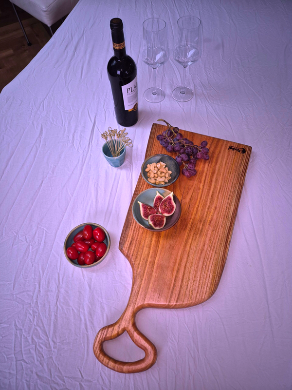Stoer, warm en met een vleugje exotisch karakter – deze borrelplank van Valse Christusdoorn trekt meteen de aandacht. Het hout staat bekend om zijn diepe, goudbruine tint en levendige nerf, waardoor deze plank een uniek kunstwerk is. Perfect om royaal te vullen met kazen, vleeswaren of kleurrijke groentes en zo het middelpunt van een gezellige avond te vormen. Dankzij de hardheid en duurzaamheid van het hout is dit niet zomaar een plank, maar een trouwe metgezel voor vele borrelmomenten. Met deze bijzondere verschijning op tafel geef je je avond een authentieke en sfeervolle uitstraling.
