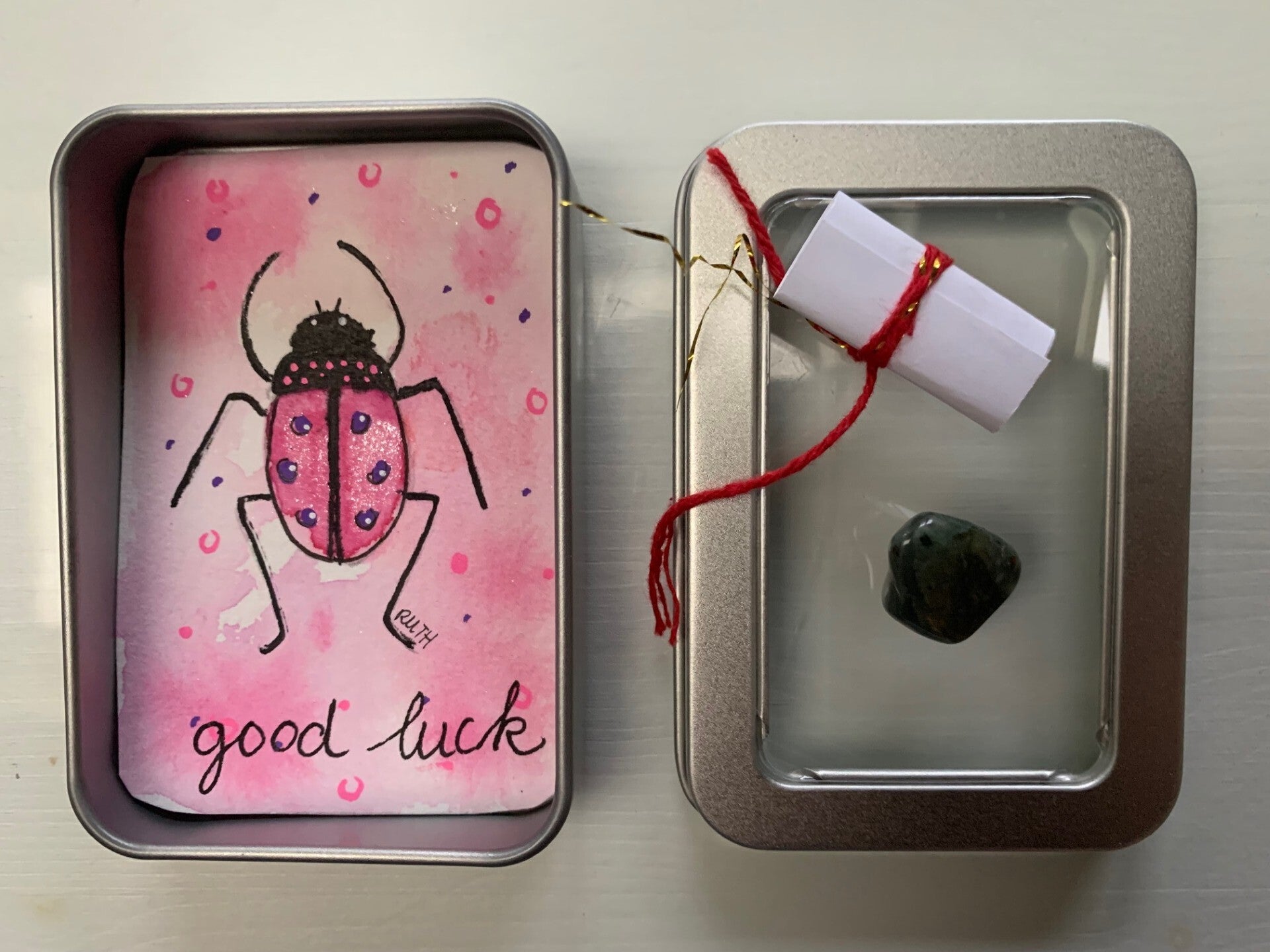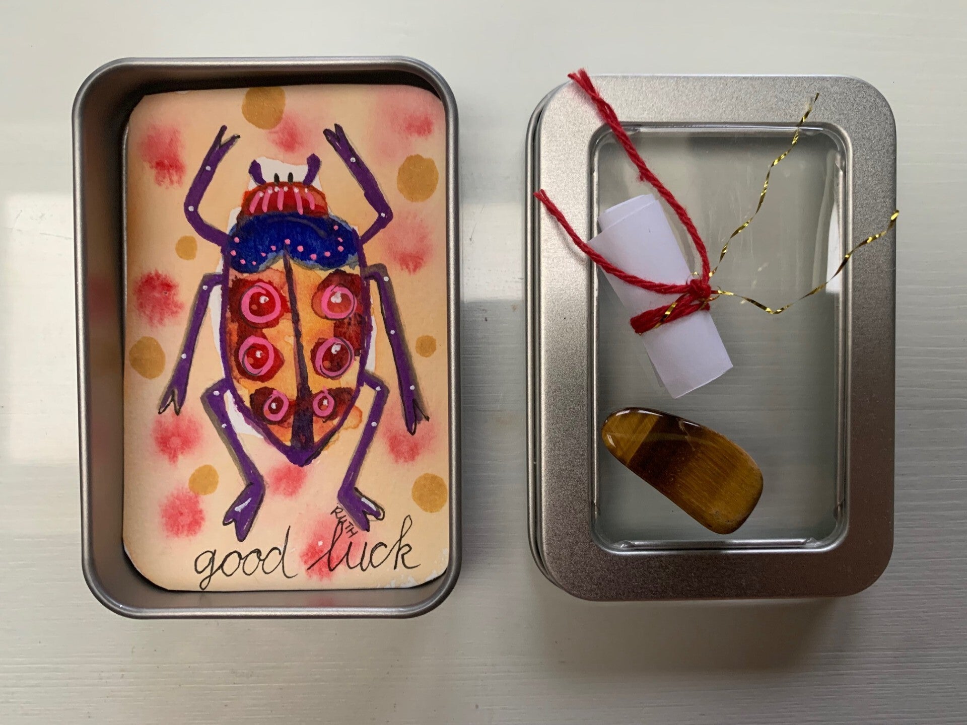 doosje met tijgeroog en tekst over de beschermende kracht van de kever. 6x9 cm